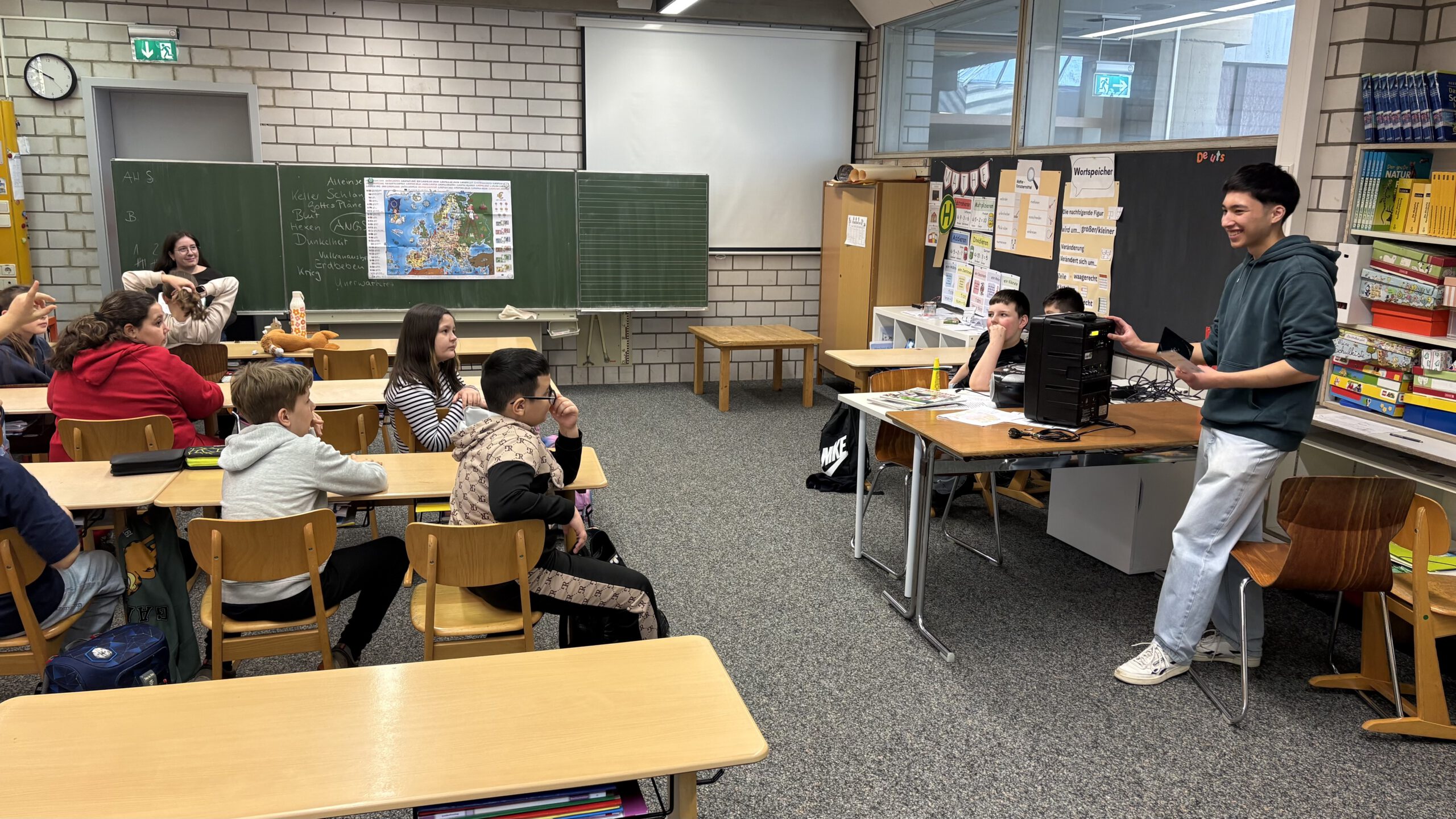 Zum Abschluss wurde es etwas leiser, aber nicht weniger spannend. Beim Sprachen-Rätsel war Konzentration gefragt. Anhand von Tonbeispielen mussten die Kinder heraushören, welche Sprache sie gerade hörten. Klingt das jetzt nach Polnisch, Spanisch oder doch eher nach Schwedisch? Es war beeindruckend zu sehen, wie viel Feingefühl unsere Schülerinnen und Schüler für die verschiedenen Klänge der EU entwickelten.
