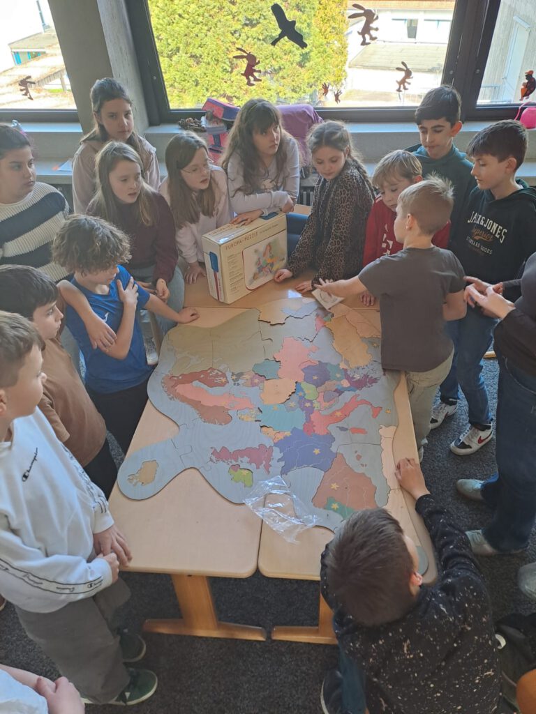 Die erste Herausforderung war gigantisch: In Windeseile mussten die Kinder riesige Europapuzzle zusammensetzen. Da war Teamarbeit gefragt! Gemeinsam wurden Küstenlinien gesucht und Gebirge an die richtige Stelle gerückt. Als die riesigen Karten fertig auf dem Boden lagen, ging es erst richtig los: Wo liegt eigentlich Finnland? Und welche Form hat Italien noch gleich? Unsere Viertklässler zeigten zielsicher auf die EU-Mitgliedstaaten und konnten fast jedes Land benennen.