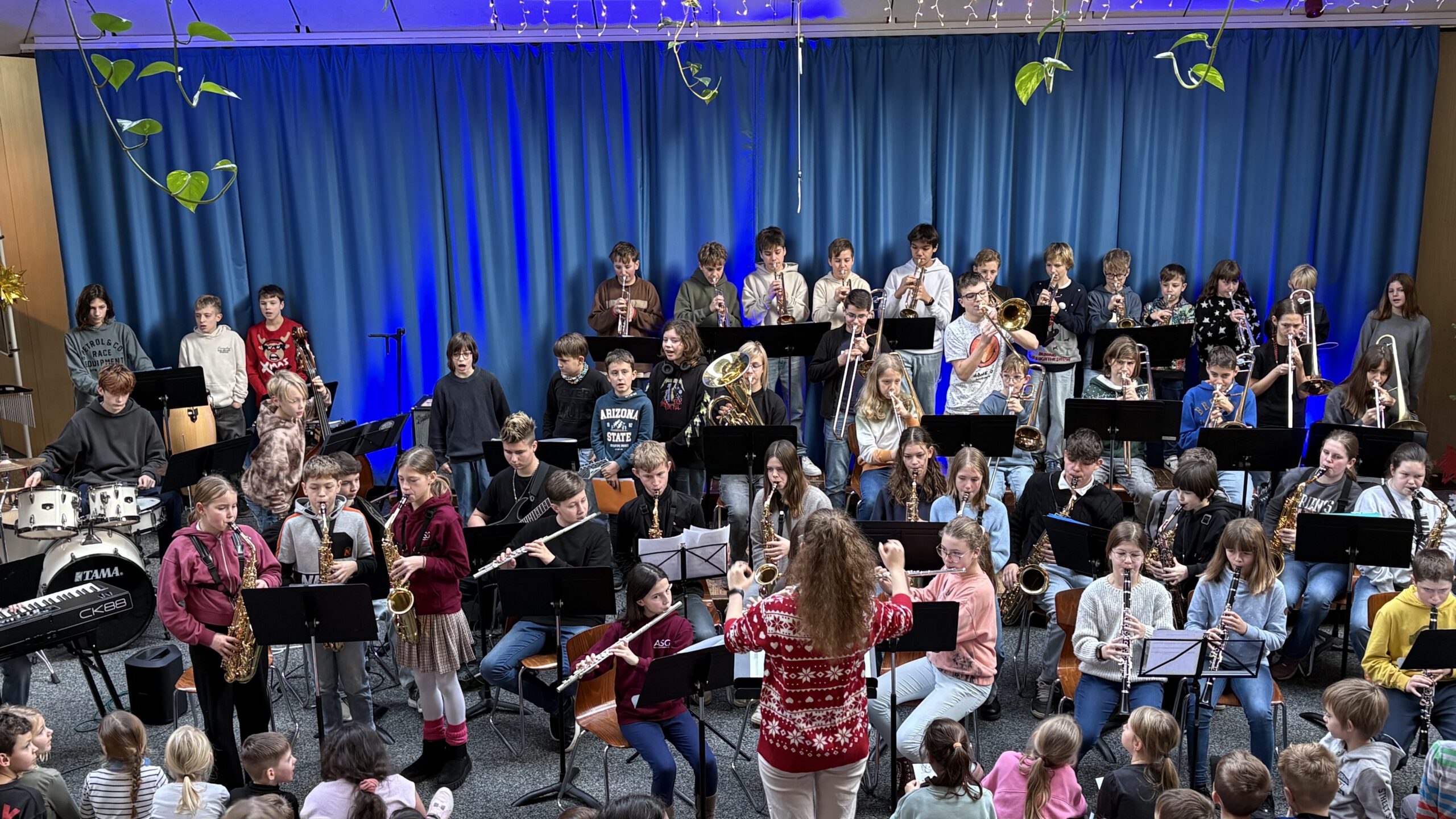 Zum krönenden Abschluss versammelten sich alle Musikerinnen und Musiker, um gemeinsam mit unserer Grundschulgemeinschaft das stimmungsvolle Lied „Stille Nacht“ zu intonieren. Dieser Moment unterstrich den Zusammenhalt über die Jahrgangsstufen hinweg und setzte einen besinnlichen Schlusspunkt unter die gelungenen musikalischen Darbietungen.
